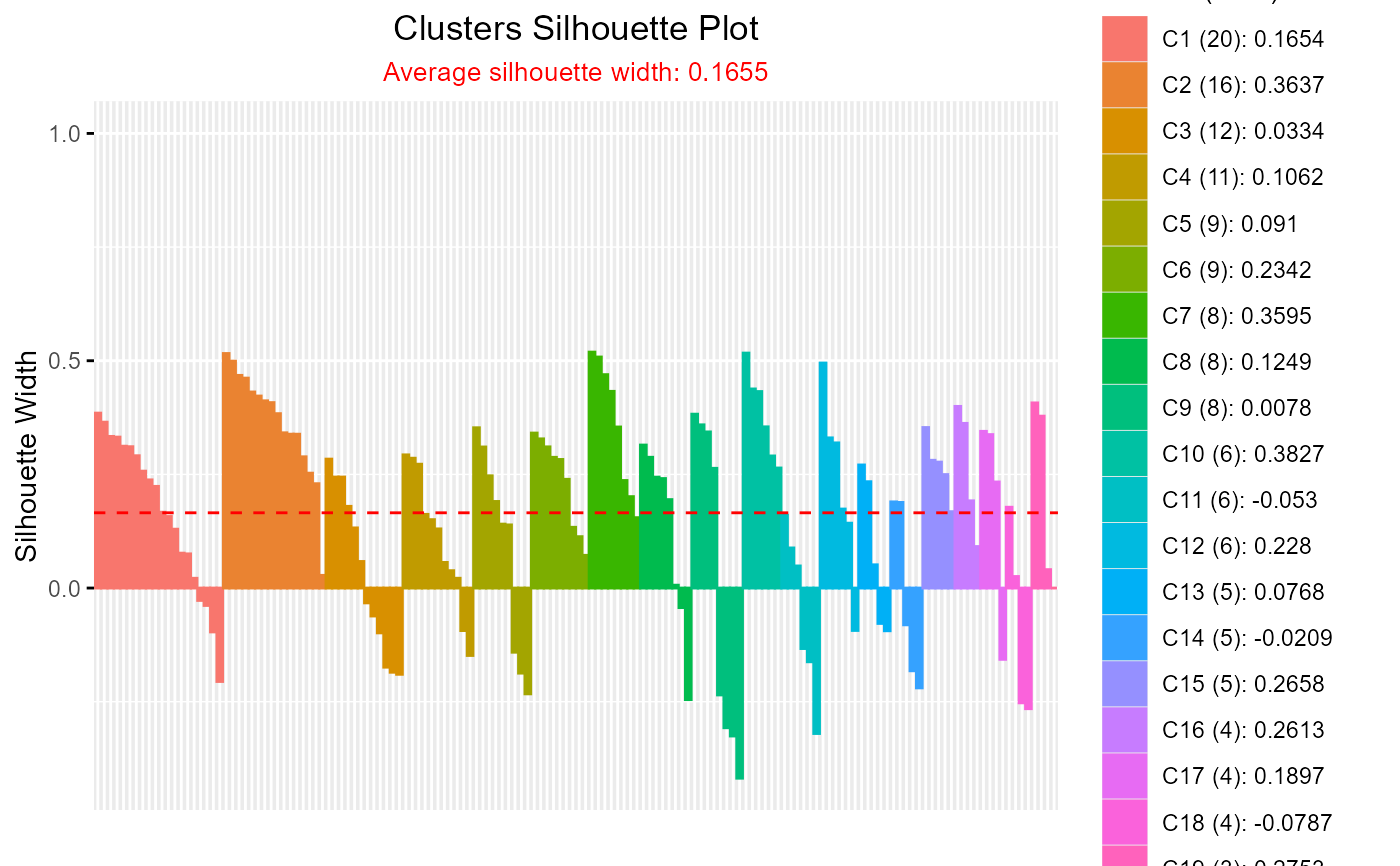 , prints a summary of average silhouette widths and sizes for each cluster in legend ("Cluster (Size): Width"). IfFALSE